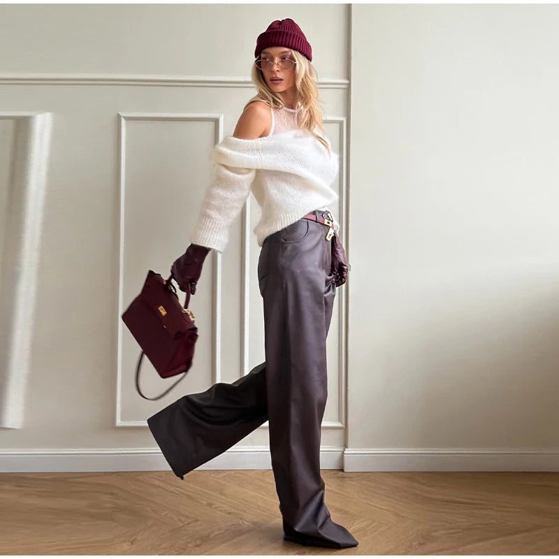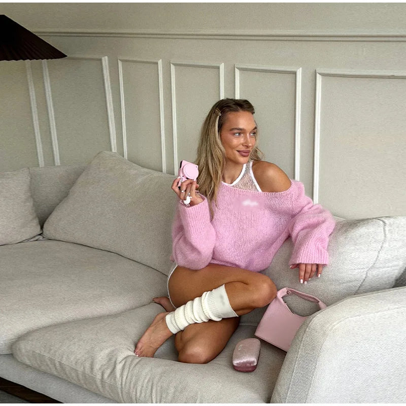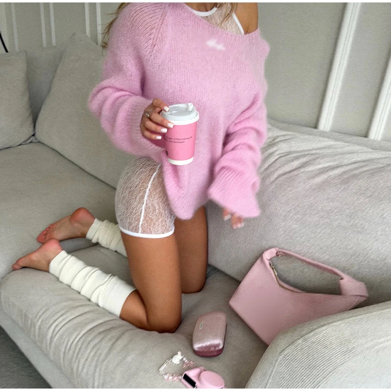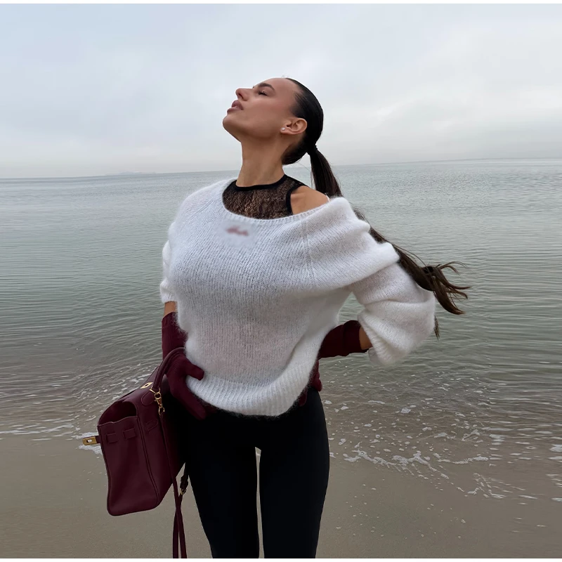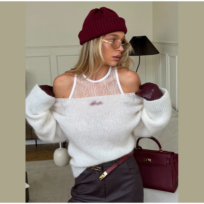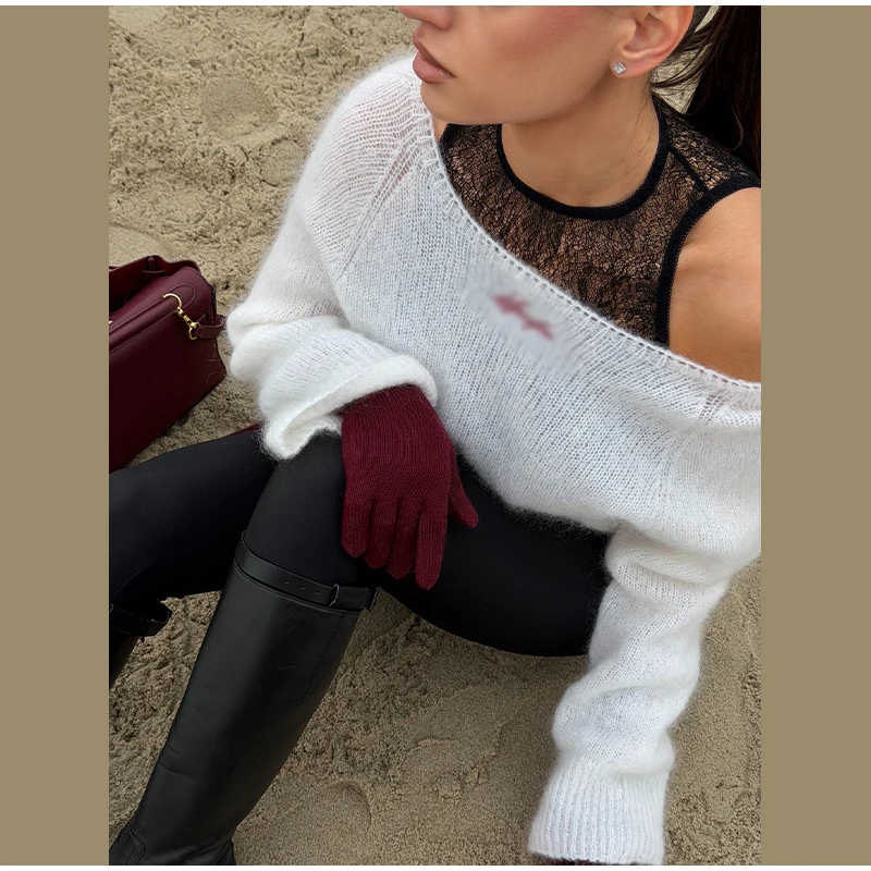 One-Shoulder Embroidered Mohair Sweater Lace Camisole Loose Fit 2025 Autumn Chic Causal Women Knit Top Fashion Sweet Lady Jumper